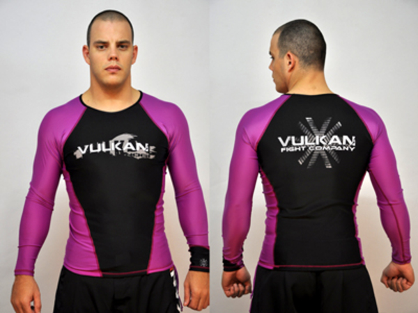 VULKAN FIGHT CO.の長袖ラッシュガード Competitionモデル 色:黒/紫 ロゴや柄はラバープリントではありませんので、洗濯や摩擦でほどけたり取れたりしない丈夫なラッシュガードです サイズチャート Sサイズ-着丈:60cm、胸幅:44cm、裄:75cm、裾幅:35cm Mサイズ-着丈:62cm、胸幅:45cm、裄:78cm、裾幅:37cm (平置きにして測りました。伸縮素材です) 予約可能商品:ご希望のサイズの在庫がゼロの時も選択し「注文」又は「予約」ボタンを押すと予約できます!