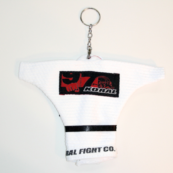 KORAL FIGHT CO. コラルの道衣型KEYホルダー 限定寝技NEWAZAモデル 色:白 縦約13.0cm 横約16.0cm 柔術衣の生地を使ったキーホルダーです ミニ柔術衣の裾にテーピングパッチと背中にロゴパッチ付き (パッチのデザインが写真と若干異なる場合がございます)