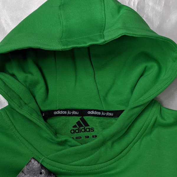 アディダス ジュニア/キッズ パーカー jiu-jitsuモデル adidas Junior/Kids Hoodie jiu-jitsu model 素材: 綿 80%/ポリエステル 20% Material: 80% Cotton/20% Polyester 色/Color:ブラジリアングリーン/Brazilian Green ポイント/Point: 5% 非常にレアなブラジリアン柔術モデルのキッズ/ジュニア パーカーです! 実寸サイズ: 128サイズ-着丈(襟下中央〜すそ):52cm、肩幅:37cm、身幅(右脇下〜左脇下):43cm、袖丈:45cm 140サイズ-着丈(襟下中央〜すそ):56cm、肩幅:38cm、身幅(右脇下〜左脇下):45cm、袖丈:48cm 152サイズ-着丈(襟下中央〜すそ):59cm、肩幅:39cm、身幅(右脇下〜左脇下):47cm、袖丈:55cm 164サイズ-着丈(襟下中央〜すそ):62cm、肩幅:40cm、身幅(右脇下〜左脇下):49cm、袖丈:62cm (平置きして測っています。多少の個体差はありますので平均値です。)