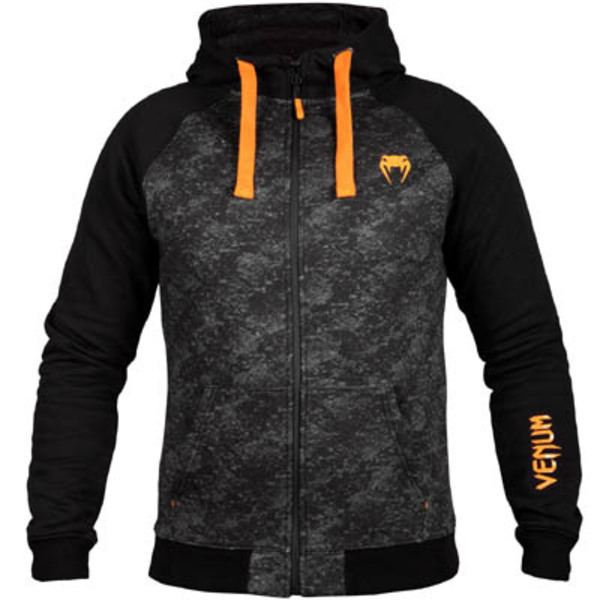 色:黒/迷彩 Color: Black/Orange Camo 素材:51% コットン Cotton - 49% ポリエステル Polyester. 裏起毛のジップアップパーカー。しっかりとした生地でありながら柔らかく肌触りの良い素材です。左胸にクールなワンポイントロゴ、そして左袖先にVENUMとプリントされており、フードのフロントトップにはブランドタグが縫い付けられています。洗練されたデザインがラインを引き締めながらも、アスリートを温かく包み込みます。 Stay warm and comfortable before and after training, with the Venum Tramo Hoodie! This Venum Hoodie will keep you warm thanks to its brushed interior which provides insulation and optimal conservation of body heat. Its adjustable hood adds comfort and additional protection against the wind and weather.