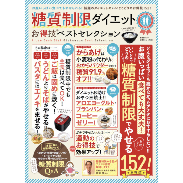 糖質制限ダイエット お得技ベストセレクション うまくいかない……、リバウンドする……そんなあなたに、本当に正しい食べ方教えます! お腹いっぱい食べても大丈夫! 「糖質制限」は、糖質の少ないものを選んで食べるだけの簡単で続けやすいダイエットです。 本誌では、そんな糖質制限で効果的にやせるためのお得情報をまとめました。 内臓脂肪を減らしてぽっこりお腹をスリムにする方法や、ダイエット後のリバウンドが少ない地中海式ダイエット食事術も解説しています。 無理なくやせるダイエットをこの1冊ではじめてみましょう! いいとこどりの糖質制限でやせるお得技152! 主食、おかず、おやつのカテゴリーに分けたお得技でわかりやすい!糖質制限についてのQ&Aで不安を解消! ガチでやせたい人用の効果的な運動のお得技もあり! 判型: A4変形 ページ数: 96ページ おもな内容 1. part1 ズボラ糖質制限ダイエットをはじめよう! 2. part2 毎日の食事で糖質制限ダイエット! 3. part3 やせる食べかたで糖質制限ダイエット! 4. part4 運動で糖質制限の効果アップ! 5. part5 知っておきたい糖質制限Q&A