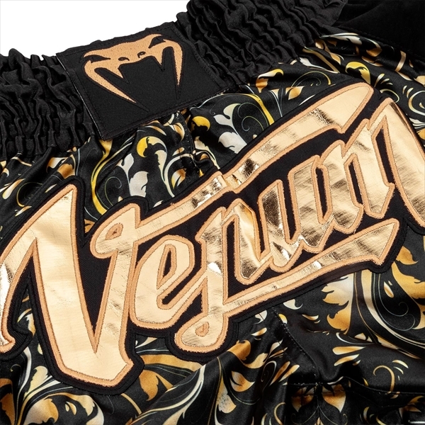 ヴェナム ムエタイショーツ Absolute モデル VENUM Muay Thai Shorts Absolute Model 色/Color:黒ゴールド Black/Gold 素材/Material:100%軽量サテンポリエステル satin polyester ポイント/Point:5% 本場タイ国でのハンドメイド、闘争本能を掻き立てるゴールドが入った豪華なデザイン。ウエストはゴム入りで、紐でも調節可能です。 実寸サイズ: XS-ウエスト幅28cm、パンツ丈:外側30cm-内側35cm S-ウエスト幅30cm、パンツ丈:外側32cm-内側35cm M-ウエスト幅33cm、パンツ丈:外側34cm-内側38cm 斜めスリットが10cm入っています。平置きにして採寸しました。手作りの為多少の誤差がございますことご了承願います。お手入れに関して:重厚な刺繍やラメ素材を長持ちさせるためにも手洗いをお勧めしています。どうしても洗濯機をご利用の場合には、裏にしてネットに入れることをお勧め致します。 THAI BOXING SHORTS VENUM ABSOLUTE MUAY THAI SHORTS - BLACK/GOLD - EXCLUSIVE DESCRIPTION Venum Absolute Muay Thai Shorts are high quality shorts designed with Thai tradition in mind. Venum Thai boxing shorts are made from lightweight, supple polyester for maximum mobility in the ring. With slit sides to increase flexibility and durability. A black velvet effect on the sides and back, and golden patches make these Muay Thai shorts a unique and eye-catching choice. TECHNICAL FEATURES 100% Polyester. Side slits: specifically designed to increase your mobility in the ring. Wide traditional belt with a tightening cord: for optimal support of the shorts around the waist. Velvet effect and golden patches: for true Thai style.Made in Thailand.