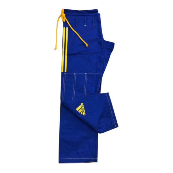 アディダス柔術衣パンツのみ コンテストモデル ヴァージョン3.0 adidas BJJ Gipants Contest Model Ver.3.0 ズボン/Pants:リップストップ/Rip Stop 綿100% Cotton ズボンウエストひも: コードタイプ Waist drawstring: Cord type 防縮加工済み/Pre-shrunk 色/Color:青・ゴールドイエロー/Blue with Gold Yellow stripes ポイント/Point: 5%! *アディダス柔術衣のハイエンドモデル。 *高い動きやすさと耐久性を実現。 *肩のストライプと前の刺繍は贅沢な直接刺繍! *パンツの生地は、軽くて丈夫なリップストップ生地を採用。 パンツすそにアディダスロゴ刺繍がすそより上15cm以内にありますのでIBJJFの規定では試合でご着用できませんので練習用としてご利用ください。 *試合に出場される場合は、各連盟・団体の道着規定に沿って出場することが必要であり、規定が各団体で違う場合もあり、その規定も随時変更になっている可能性がございますので、出場前に主催者にご確認されることをお勧め致します。 サイズ目安表/Size Chart: A0: 159cm - 165cm A1: 165cm - 173cm A2: 173cm - 180cm (これらはあくまで目安です。) 実寸サイズ: A0ズボン-ウェスト幅:約52cm、ズボン丈:約92cm、股下:約70cm A1ズボン-ウェスト幅:約52cm、ズボン丈:約94cm、股下:約71cm A2ズボン-ウェスト幅:約54cm、ズボン丈:約101cm、股下:約75cm ハンドメイドの為、出来上がりサイズが多少前後する場合がございます。 *この道着は、海外で製作されており、縫製が荒い(曲がっている、縫い幅が違う等)、縫い直しのある場所がある、製作時に付いたと思われる小さな汚れが付いている場合がございます。競技上問題が無い場合、または洗濯によりその汚れが薄くなるもしくは落ちると見込まれた場合は、ご返品、交換の対象外となることもございますことご了承願います。
