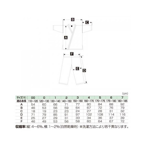 商品説明 帆布生地(薄手)を使用する事で、道着を着慣れない方にも違和感なく着ていただけます。 蹴りやパンチも抵抗感無くスムーズに繰り出せ、長い練習で感じる道着の重さを感じさせない軽量タイプになっています。 ※内紐付き サイズ 4号(0〜7号サイズの中で在庫の無いサイズはお取り寄せとなります) 素材 ポリエステル52%、綿48% 収縮率 縦 4〜6%、横 1〜2%※表記は自然乾燥時の数値です。※洗濯方法等により若干異なります。 適応身長 3号 150~160cm 4号 160~170cm 5号 170~175cm 6号 1750~180cm 実寸サイズ 4号上衣:胸幅約67cm、着丈約82cm、裄丈(首後中央~袖先)約64cm、袖幅約17.5cm 4号 ズボン:ウエスト幅約60cm、パンツ丈約(前)100cm、(後)105cm、もも幅約34cm、すそ幅約28cm 5号上衣:胸幅約72cm、着丈約84cm、肩幅約72cm、裄丈(首後中央~袖先)約66cm、 5号 ズボン:ウエスト幅約64cm、パンツ丈約108cm、もも幅約36cm、すそ幅約28cm *平置きにし、採寸しております。手作りのため個体差がございますことご了承願ください。 自然乾燥時の収縮率:4~6%(洗濯方法により若干異なります)