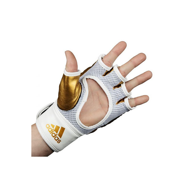 アディダス ニュースーパーファイトグローブ/オープンフィンガーグローブ adidas Fight Glove / MMA Open-finger Gloves New Speed Model 色/Color:白ゴールド White/Gold 素材/Material: 素材:PU3G・ウレタン・ナイロン/Artificial Leather (PU,Urethane foam,Nylon) ポイント/Point: 5% *耐久性の高い合成皮革とフォームを採用。 *ベロクロアとしっかりとしたバンドにより最適なフィット感を実現。 *Outer shell in PU material and resistant foam for better durability. *Velcro and rigid band strap closure for optimal support. *新しく開発したIMF機能による衝撃吸収性と完璧なフィット感。