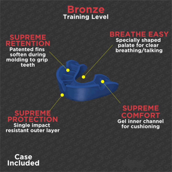 OPROマウスピースはイギリス生まれの最高品質のマウスピースです。 イギリスの歯科医師によって、スポーツバイオメカニクスに基づいて製作した英国産のマウスガードです。 OPROフィンと呼ばれる「ヒダ」が付いております。 噛んで形を作る時に、ヒダが歯の間に入り込んで固定されるため、オーダー製品のように着け心地が良くなります。 また表面素材がシールドで覆われ、外からの衝撃やくいしばる力から歯を保護するとともに、脳障害予防や集中力の強化に役立ちます。 ケース付き 取り付け方(ご注意-熱湯なので手や口の中のやけどに十分ご注意の上フィッティングを行ってください。) 1.やかんか小さいフライパンの中でお湯を沸かし、最低15秒間、沸騰させます。 2.素早く沸騰したお湯を陶製のボウルの中に注ぎます。 3.OPRO マウスピースを正確に20秒間、湯の中につけます。 *注意! 20秒より長く熱湯の中に入れておくと、損傷する可能性があります。 4.OPRO マウスピースをボウルから出し、(取り付けハンドルが含まれていない場合スプーンを使ってください)、1秒間、冷水の中に浸します。 5.OPRO マウスピースを慎重に、口の中に入れ、上の歯を覆うようにはめ、しっかりかみ合わせます。正確に30秒間、唇と頬の上を押し、確実に歯と歯茎の上の位置にぴったり合うようにします。 6.OPRO マウスピースはその位置に保ったまま、少なくともカップ半分の冷水を、OPRO マウスピースの周りに完全に循環させながら、冷水を口に含ませてください。 7.口を開けたり、閉じたりして、うまく合っているかどうかをチェックします。OPRO マウスピースはその場所にとどまっていなければならず、簡単に上の歯と歯茎から移動してはなりません。