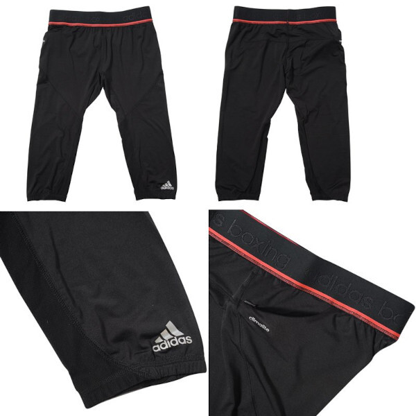 アディダス レギンス adidas Leggins / Compression Spats 色/Color:黒/ショックレッド Black/Shock Red 素材/Material: ポリエステル Polyester 84%、 伸縮素材 Spandex16% ポイント/Point: 5% *アディダスコンバットスポーツ用に開発された7分丈のレギンス/スパッツ。柔軟性と速乾性を併せ持ちさらっとした着心地。透け感はありません。 *どの方向にも伸縮性を持っている生地の採用によりトレーニング時などにおける動きやすさを実現。 *すそにアディダスロゴがプリントされ、ウエストはadidas boxing と透かしロゴが入っていますがあまり目立ちませんので他の用途でご利用になれます。幅5cmの総ゴムでしっかりとホールドされ、右サイド部分は、ジップ付きミニポケットが付いています。内股部分には透けない目の細かいメッシュ素材を採用。 *Fight leggins for martial arts/combat sports from adidas Combat lines. *adidas logo on bottom. *Slightly stretchable in all directions, this fabric allows an improved mobility in any direction at training. *Spats provides better flexibility and quick-drying properties for a better comfort. *Elastic waist band provides perfect fit. *こちらの商品は在庫限りとなります。 実寸サイズ S-size:ウエスト周り:(ゴム):約68cm、着丈:約66cm,、すそ幅:約14cm、股下:約49cm 伸縮素材なので多少の差異があります。