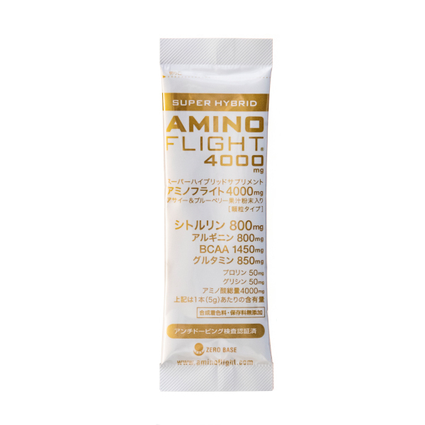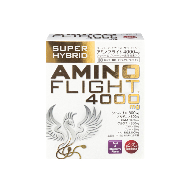 Amino Flight 4000mg Super Hybrid 30-piece pack 運動時にカラダ・筋肉に必要な、BCAA(分岐鎖アミノ酸)とアルギニン、更に注目のアミノ酸「シトルリン」を独自に配合。アミノ酸特有のえぐみや苦みを抑えたデザート感覚・顆粒タイプのアミノ酸サプリメントです。おいしく飲んでパワフルに、そしてキレイに。限界に挑戦するプロアスリートから美を追求する女性、年齢を超え、体力・健康を追求するシニアの方々まで、幅広く皆様へおすすめできる商品です。 2週間〜1ヶ月を目安にお飲みいただける30本入り。 定期的に運動をしながら効果を試したい方にオススメです。(1日1本~2本を目安にした場合) 内容量:30本入パック (5g x 30本) 顆粒・ダイレクトインタイプ 日本製 Made in Japan アンチドーピング認証取得済み ポイント対象外商品:この商品にはポイントは付与されません。 究極のアミノ酸サプリメント ◆瞬発・集中・持久・燃焼・回復・ハリツヤ系アミノ酸8種類4000mg配合! ◆シトルリン X アルギニン 1:1 同量・高配合で一気にパフォーマンスUP! ◆シトルリン X マレートの相乗パワーでエネルギーサイクルを加速! ◆BCAAなどの吸収を驚異的にアップ! ◆スーパーフルーツと呼ばれるアサイー&ブルーベリー天然果汁末配合。アミノ酸特有の苦みやえぐみを極力抑え飲みやすくフルーティな味で美味しさと栄養UP! 高品質で安心・安全 ◆アンチドーピング認証取得済で安心・安全 ◆日本GMP認定工場にて製造の国産で安心 ◆一回飲み切り密封スティックタイプで衛生的 ◆シトルリンやアルギニンの同時配合による有効性に関して協和発酵バイオ(株)が日米特許を取得しており高い信頼性 ◆原料のアルギニンやシトルリンには医薬品原料メーカーの協和発酵バイオ(株)がアスリート向けに提供する、高純度アミノ酸の使用でさらに安心・安全 こんな方におすすめ ◆瞬発・持久系アスリート ◆健康美を追求する女性 ◆集中・パワーを必要するビジネスマン ◆活力を求めるシニアの方々 お召し上がり方 ◆1日1~3本を目安にお飲みください。 ◆直接お口に入れ、水などと一緒にお飲みください。