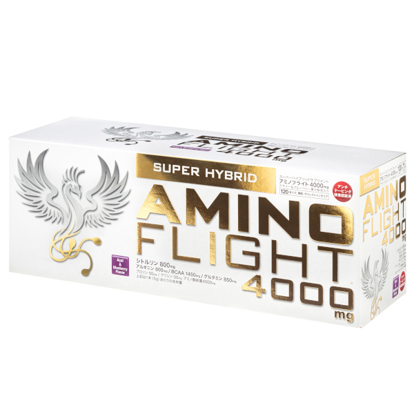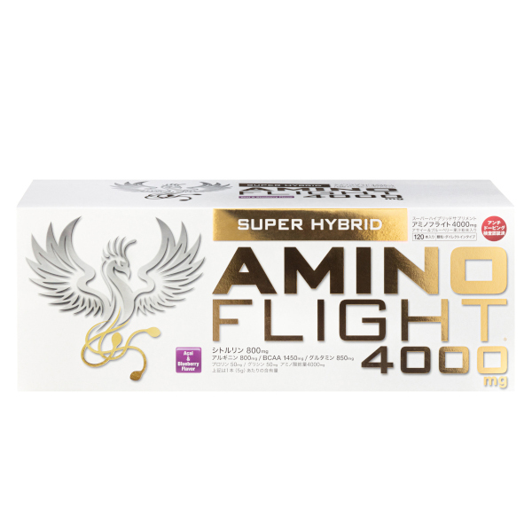 Amino Flight 4000mg Super Hybrid 120-piece pack 運動時にカラダ・筋肉に必要な、BCAA(分岐鎖アミノ酸)とアルギニン、更に注目のアミノ酸「シトルリン」を独自に配合。アミノ酸特有のえぐみや苦みを抑えたデザート感覚・顆粒タイプのアミノ酸サプリメントです。おいしく飲んでパワフルに、そしてキレイに。限界に挑戦するプロアスリートから美を追求する女性、年齢を超え、体力・健康を追求するシニアの方々まで、幅広く皆様へおすすめできる商品です。 継続して飲まれる方やご家族で飲まれる方に便利な120本入り。 シトルリン、アルギニン、BCAAの摂取を続けることで健康を目指す皆様へ。 内容量:120本入パック (5g x 120本) 顆粒・ダイレクトインタイプ 日本製 Made in Japan アンチドーピング認証取得済み ポイント対象外商品:この商品にはポイントは付与されません。 この商品は送料無料! (沖縄及び離島地域を除く) Free Shipping (within Japan except Okinawa and other islands.) ! 究極のアミノ酸サプリメント ◆瞬発・集中・持久・燃焼・回復・ハリツヤ系アミノ酸8種類4000mg配合! ◆シトルリン X アルギニン 1:1 同量・高配合で一気にパフォーマンスUP! ◆シトルリン X マレートの相乗パワーでエネルギーサイクルを加速! ◆BCAAなどの吸収を驚異的にアップ! ◆スーパーフルーツと呼ばれるアサイー&ブルーベリー天然果汁末配合。アミノ酸特有の苦みやえぐみを極力抑え飲みやすくフルーティな味で美味しさと栄養UP! 高品質で安心・安全 ◆アンチドーピング認証取得済で安心・安全 ◆日本GMP認定工場にて製造の国産で安心 ◆一回飲み切り密封スティックタイプで衛生的 ◆シトルリンやアルギニンの同時配合による有効性に関して協和発酵バイオ(株)が日米特許を取得しており高い信頼性 ◆原料のアルギニンやシトルリンには医薬品原料メーカーの協和発酵バイオ(株)がアスリート向けに提供する、高純度アミノ酸の使用でさらに安心・安全 こんな方におすすめ ◆瞬発・持久系アスリート ◆健康美を追求する女性 ◆集中・パワーを必要するビジネスマン ◆活力を求めるシニアの方々 お召し上がり方 ◆1日1~3本を目安にお飲みください。 ◆直接お口に入れ、水などと一緒にお飲みください。