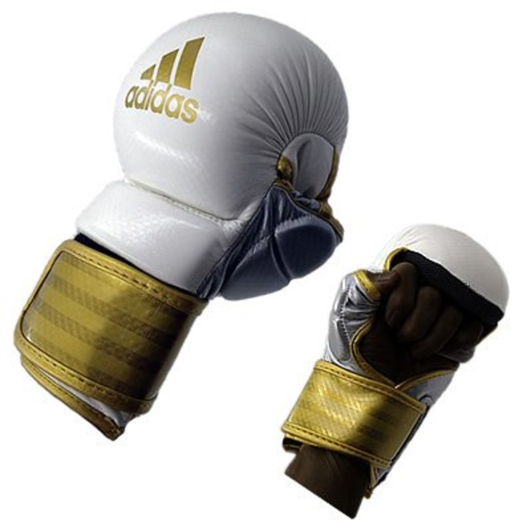 adidas MMA Training Grappling Gloves 色/Color:白ゴールド White/Gold 素材/Material: 合成皮革・ウレタン/PU Synthetic Leather, Urethane ポイント/Point: 5% MMA/総合格闘技の練習やスパーリングに最適なオープンフィンガー/パウンドグローブです。 *新しく開発したIMF機能による高い衝撃吸収性。 *耐久性の高い高級合成皮革を採用。 *ベロクロアとしっかりとしたバンドにより最適なフィット感を実現。 Sparring and Training MMA/Open-finger gloves. *Made of high quality PU synthetic leather. *Newly developed IMF feature for shock absorption and perfect fit. *Finger with reinforcement and palm also lined from underneath. *Extra padding below punch area. *Velcro and rigid band strap closure for optimal support.