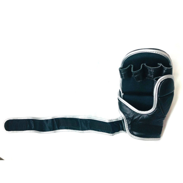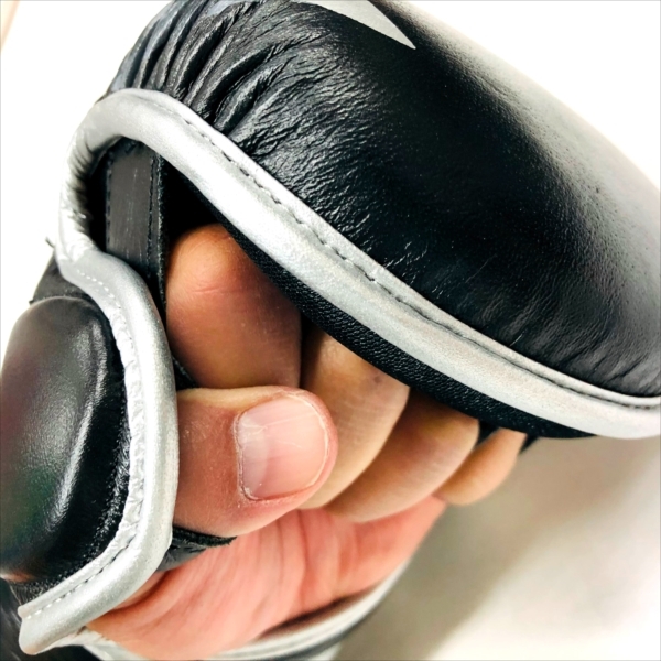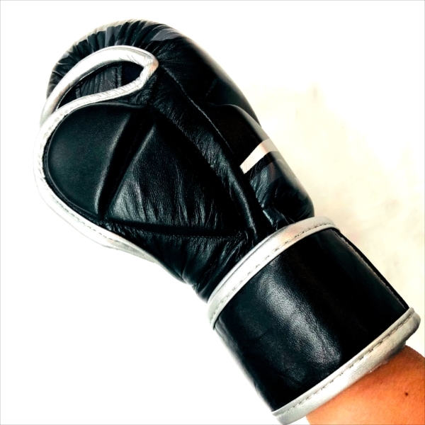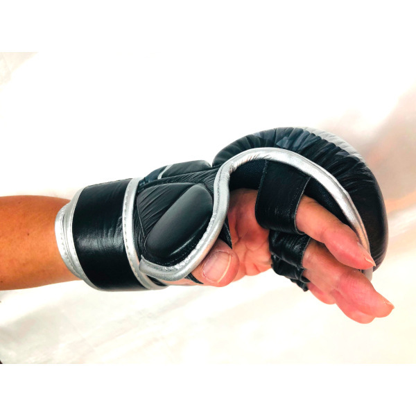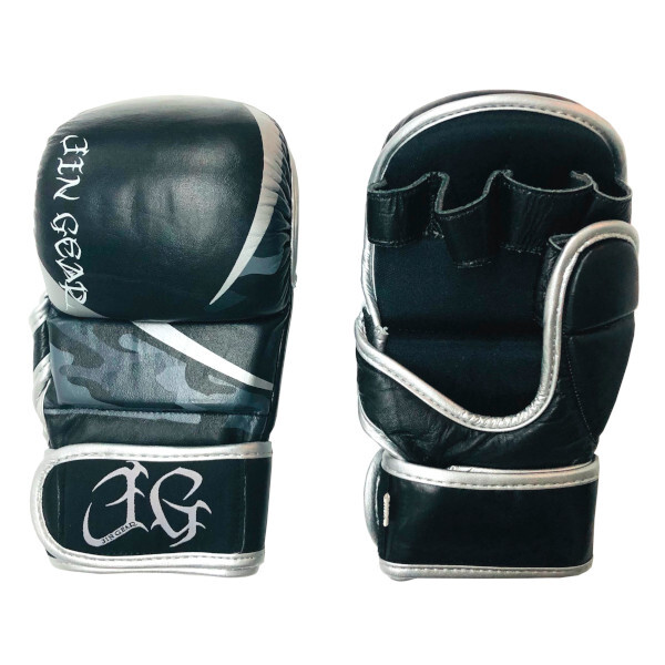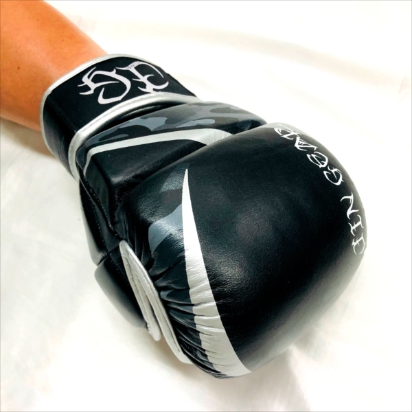 JIN GEAR Open-finger Gloves Grip Bar Type 素材/Material : 本革/Cowhide leather 色/Color : 黒カモシルバー/Black Camo Sliver サイズ/Size : S/M, L/XL ベルクロ(ベロクロ/マジックテープ) 式 Velcro (Magic tape) Typeでがっちり手首を固定。 親指カバーが付いているタイプ(with Thumb covers)。 手のひら側(Palm)はつかみを妨げないオープンなつくり。スパーリング用に作られたMMAグローブです。MMAのほか、グラップリング、サンドバッグ、パンチングミット打ちなどのトレーニングにもご利用頂けます。