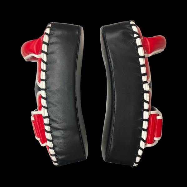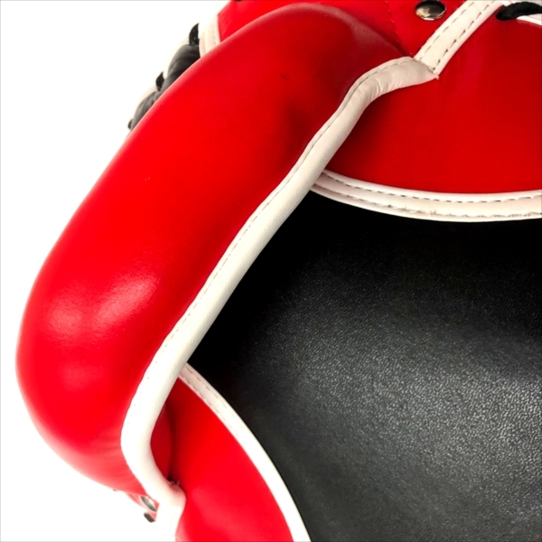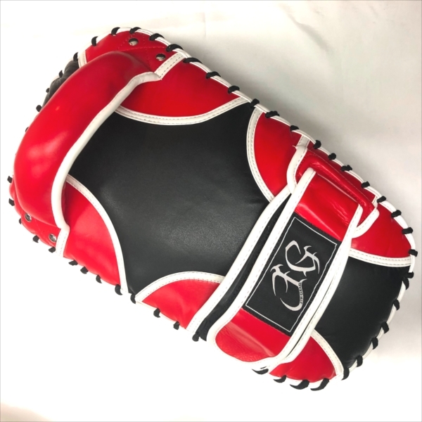 JIN GEAR Curved Kick Mitt Cowhide Leather 色/Color:黒(赤) Black/Red サイズ/Size:・縦/Length 約35cm ・横/Width 約22cm・厚み/Thickness 約11cm 重量/Weight: 約870g/1個 Approx 870g per unit *素材/Material:本革/Cowhide leather ポイント/Point: 5% *しっかりとした縫製。 *ベルトのマジックテープ(ベロクロア)の止める方向により右手用と左手用とあり、着脱し易いつくり。 *格闘技に適した高級本革を採用。 *造りは重厚だが軽量タイプ。持ち手も疲れません! *日本でデザインされ、品質を妥協することなくベストプライスを目指した、本革でハイスペックなカーブキックミット。