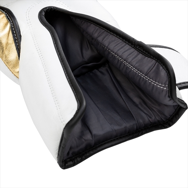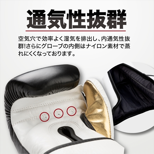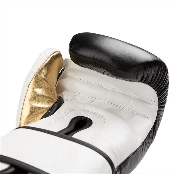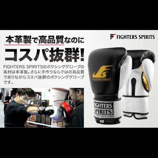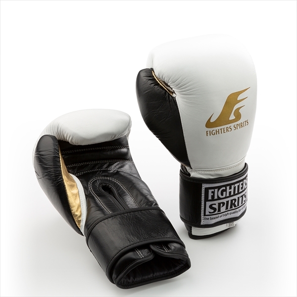 FIGHTERS SPIRITS Boxing Gloves PRO Model Real Leather 色:ホワイト/ブラック/ゴールド Color: White/Black/Gold 素材/Material: 本革/Genuine leather ポイント/Point: 5% 国内送料無料!(沖縄・離島のぞく) Free Shipping! (Domestic excluding Okinawa and other islands.) プロ納得の高級ボクシンググローブ。その仕様はプロ向けに作られており、柔らかい革とウレタンは握りやすく、パンチも打ちやすいので、高いクオリティを誇ります。牛革はReal quality cowhide leather(リアルクオリティーカウハイドレザー)を使用し、職人の手作業で作っており、Latex hand molding fighter series(レーテックスハンドモウルディングファイターシリーズ)製作です。グリップバーは握りやすい構造で、空気穴が湿気を排出し、内側のナイロン素材など通気性に優れています。スパーリング以外にもミット打ち、サンドバッグ打ちなど広い用途で使用出来ます。高品質である柔らかい革とウレタン素材は使うほど馴染みます。 This model is a high-end boxing glove that convinces professionals. Its specifications are planned for professionals, and its soft leather and urethane bring you easy grips and smooth punches. The Real quality cowhide leatheris adopted for outter material and is made by hand by craftsmen as Latex hand molding fighter series production. The grip bar is designed for easy gripping, and the air holes allow moisture to drain out, and the nylon material inside provides excellent ventilation. In addition to sparring, it is best for a wide range of other training sessions such as mitt training and sandbag training. High-quality soft leather and urethane materials will become more comfortable the more you use them.