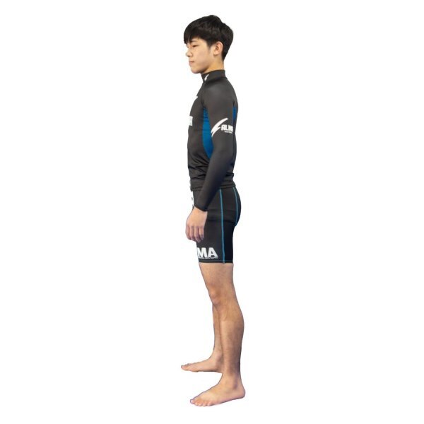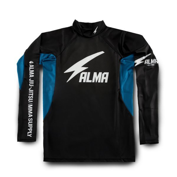 ALMA Rashguard Long Sleeve THUNDER Model Made in Japan 日本製 Made in JAPAN 素材/Material: ポリエステル/Polyester 82%, ポリウレタン/PU 18% 色/Color:黒青白 Black/Blue/White ポイント/Point: 5%! *UVカットに優れた生地を使用しているので、屋内外を問わず様々なスポーツシーンに対応します。 *道着の襟での摩擦を軽減するハイネック仕様のロングラッシュガード! *生地や縫製はすべて日本製にこだわった逸品。 *The fabric has excellent UV protection and is suitable for a variety of sports activities both indoors and outdoors. *Long sleeve rash guard with a high neck to reduce friction at the collar/lapela of gis ! *All fabrics and sewing are made and finished in Japan.